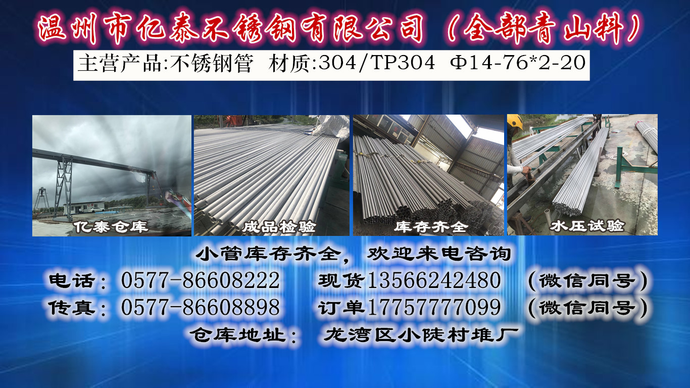 浙江盛洋不銹鋼有限公司是集生產銷售于一體的綜合性大型企業。專業生產各種型號的不銹鋼無縫管及工業無縫管,以TP304/304材質為主。資源充足,品種齊全,庫存量大,價位特低,供貨時間最短 拼搏實干,開拓創新,積極進取,合作共贏的原則,以優質的服務,靈活的經營模式開拓市場,在廣大新老客戶的協助支持下,不斷發展壯大。誠信是企業的生命,您的需要是我們的立業之本! 電話:0577-86608222 熱忱歡迎廣大新老客戶蒞臨指導!