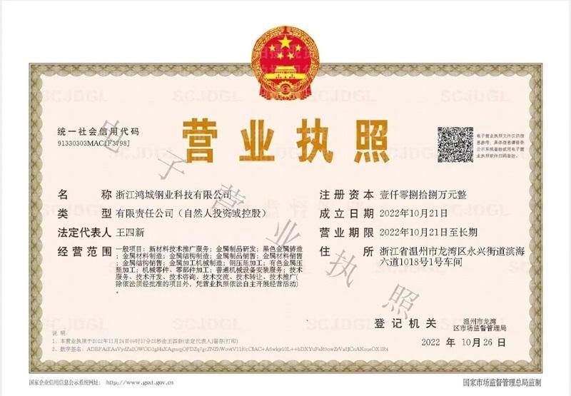 企業名稱 | 浙江鴻城鋼業科技有限公司 | 統一社會信用代碼 | 91330303MAC1F3798J |