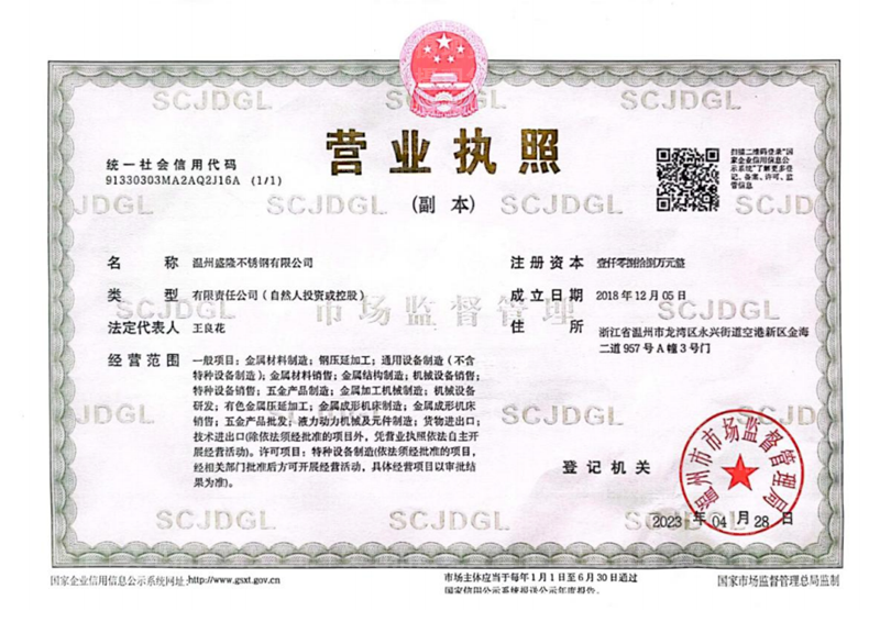 | 企業(yè)名稱 | 溫州盛隆不銹鋼有限公司 | 統(tǒng)一社會信用代碼 | 91330303MA2AQ2J16A |
