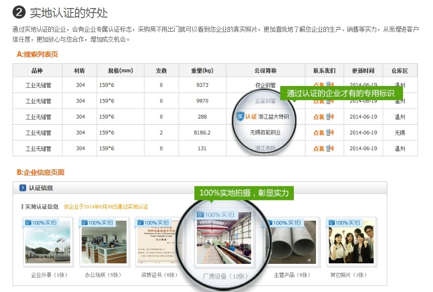5、不銹鋼現(xiàn)貨超市網(wǎng)推出實地認(rèn)證服務(wù) http://www.szhy6261.com.cn/sdrz/ 實地認(rèn)證是現(xiàn)貨超市網(wǎng)于2014年6月份推出的一項針對不銹鋼生產(chǎn)企業(yè)的增值服務(wù),現(xiàn)貨超市網(wǎng)的工作人員到不銹鋼企業(yè)所在地進(jìn)行實地考察,核驗企業(yè)相關(guān)資料的真實性, 現(xiàn)場對企業(yè)的相關(guān)資質(zhì)材料、辦公場所、廠房車間、生產(chǎn)檢測、產(chǎn)品、倉庫倉儲等進(jìn)行拍照,如實反應(yīng)企業(yè)的真實情況的認(rèn)證服務(wù)。通過實地認(rèn)證的企業(yè),會有企業(yè)專屬認(rèn)證標(biāo)志,采購商不用出門就可以看到企業(yè)的真實照片,更加直觀地了解不銹鋼企業(yè)的生產(chǎn)、銷售等實力,從而增進(jìn)客戶信任度,增加成交機會。可笑的是,引得某些山寨小站東施效顰,以為只是單純的拍拍照片放置上去了事,希望廣大不銹鋼企業(yè)能分辨清晰。