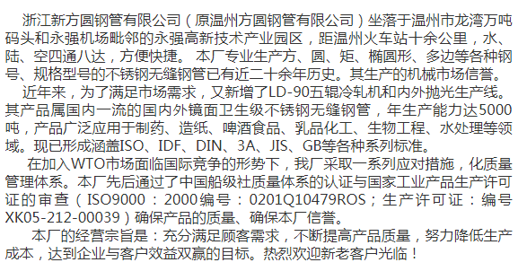 浙江新方圓鋼管專業生產TP316L不銹鋼無縫圓管、方矩管,高品質換熱器管 |